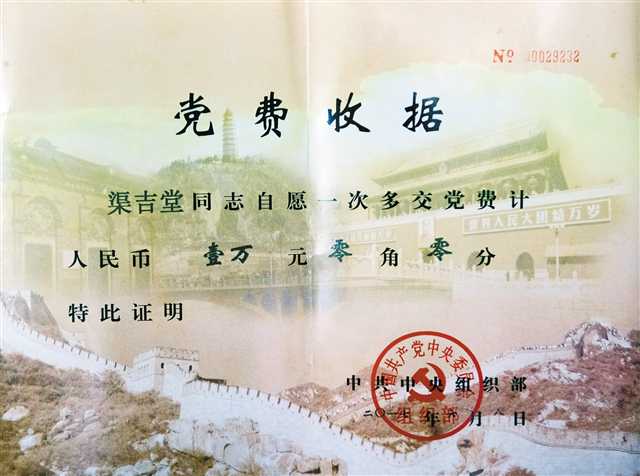 渠吉堂老人萬元“特殊黨費”收據。首席記者 謝智強 翻拍