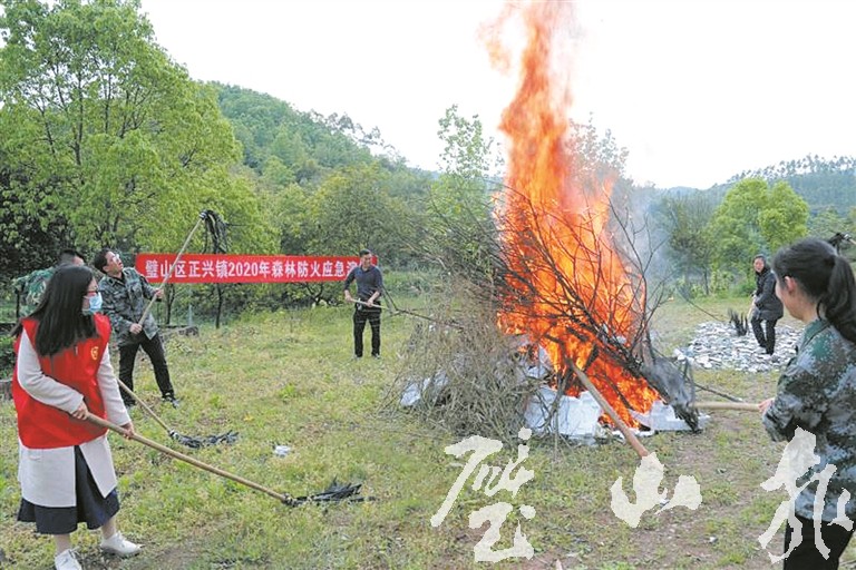 4月1日,正興鎮組織相關單位開展2020年森林防火應急演練,加強清明節前森林防火安全保障,提升處置森林火災的綜合能力。圖為演練現場。