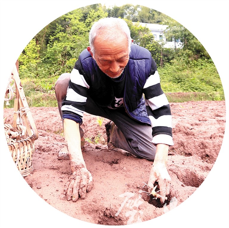 見到申光財時,他正蹲在地里栽種著姜苗。不一會,原本裝滿姜苗的籃子變空,原本荒蕪的土地增添了一縷生機?!安缓靡馑甲屇銈兊染昧?,我們去院子里聊吧?!备赏晔掷锏幕?,申光財對記者說道。