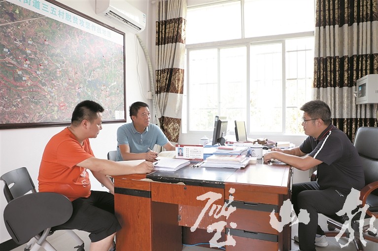 蔡廷江(中)和駐村工作隊其他成員商議脫貧攻堅事宜