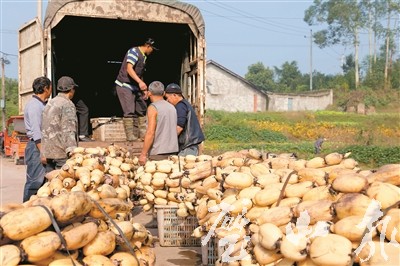 時下正是蓮藕收獲的季節。近日,健龍鎮睦佳村蓮藕基地里,100畝蓮藕長勢喜人,農戶們趁著晴好天氣加緊采摘,將一筐筐蓮藕過稱、裝車,到處是一派繁忙豐收的景象。(記者 王淼 攝)