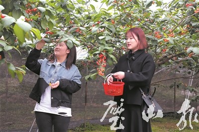 進入4月,來鳳街道鹿河村家中果園的溫室大棚櫻桃陸續成熟,南早紅、紅妃等多個品種的櫻桃如一串串紅色珍珠,掩映在翠綠的枝葉間,格外誘人,吸引了不少來自璧山城區以及重慶主城的游客觀光、采摘。