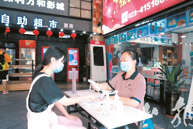 影院營業當天下午4點05分,保利萬和國際影城南門唐城店,即將開場的電影《尋夢環游記》迎來了復映后的首批觀眾。記者在現場看到,影院入口設置了觀眾信息登記臺,大廳內隨處可見“無接觸觀影”宣傳資料和“今日已消毒”指示牌,工作人員正在給觀眾測量體溫,檢驗渝康碼并進行實名登記,提醒觀眾觀影期間必須全程佩戴口罩,而場外的零食賣品部也遵照規定沒有開業。