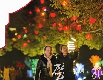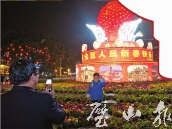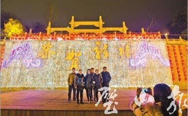 2月12日,秀湖公園百姓舞臺,市民在燈飾下合影。