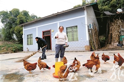 2月15日下午,璧城街道大塘村,榮廷江夫婦一邊忙著喂雞一邊打掃院子,歡歡喜喜過新年。