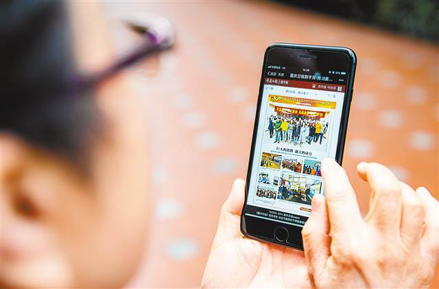 三月十一日,渝北區(qū),一市民正通過手機(jī)閱讀《重慶日?qǐng)?bào)》電子版,學(xué)習(xí)貫徹習(xí)近平總書記參加重慶代表團(tuán)審議時(shí)的重要講話精神。記者 齊嵐森 攝 |