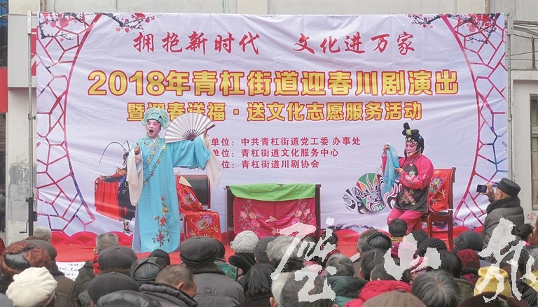 “看今朝落難戲子無人問,馬門內名優嘔血困風塵……”近兩年,每逢節假日,青杠街道的街頭巷尾總會傳來幾句余音繚繞川劇唱腔。演員們身著戲服,找塊空地一站,鑼鼓一敲,樂曲一放,就搭好了一個舞臺。路過的市民或是駐足圍觀,或是搬出小板凳靜坐欣賞,一場“川劇坐唱”就此精彩上演。