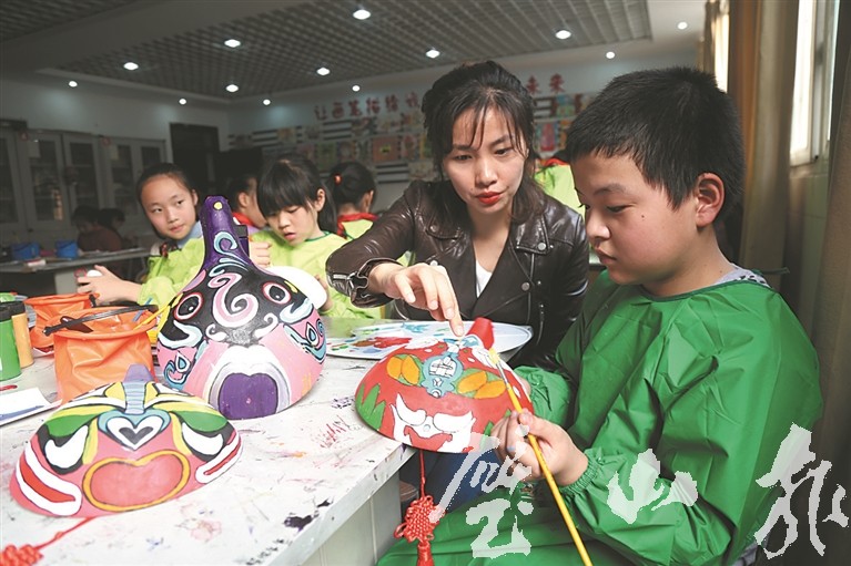 11月17日,金劍小學一教室內,老師指導學生在馬勺上創作傳統臉譜畫。據了解,該校根據不同年齡段的學生特點,分別推出風箏繪畫、葫蘆彩繪、勾勒馬勺臉譜等傳統手工藝創作體驗課,讓學生了解非物質文化遺產的魅力。(記者 孫茜 攝)