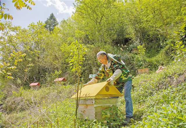 4月16日,華溪村村民馬成茲在山林中喂養中蜂。