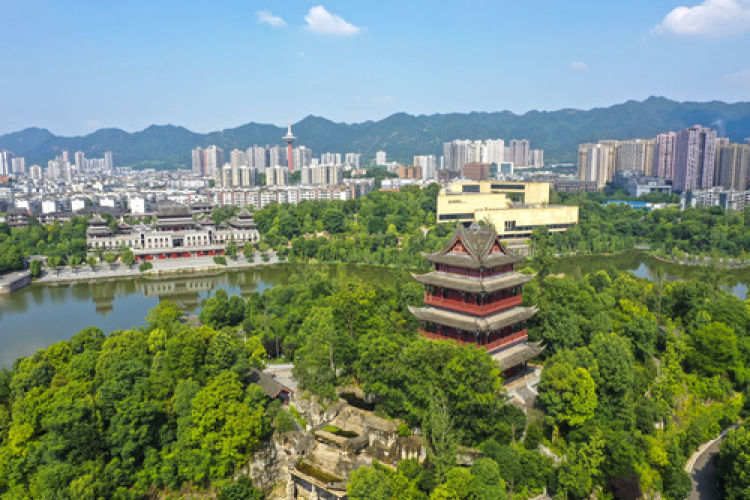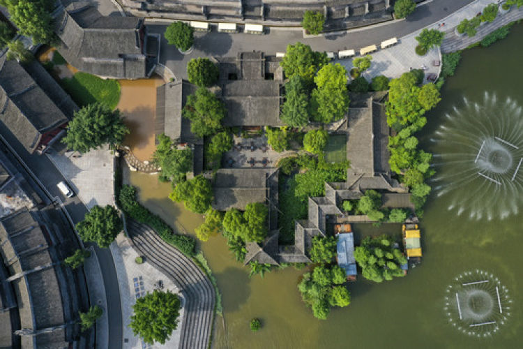 ↑這是7月10日無人機拍攝的重慶璧山秀湖國家濕地公園仿古建筑群秀湖水街的景色。新華社記者 劉潺 攝