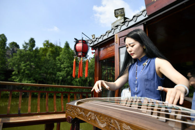 ↑琴師在璧山秀湖國家濕地公園的湖光山色間彈奏古箏(7月10日攝)。新華社記者 劉潺 攝