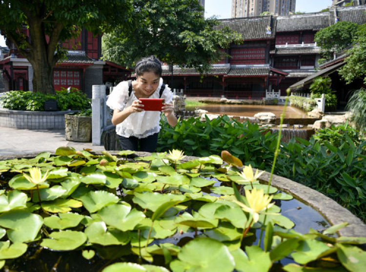 ↑一名游客用手機拍攝重慶璧山秀湖國家濕地公園的景色(7月10日攝)。新華社記者 劉潺 攝