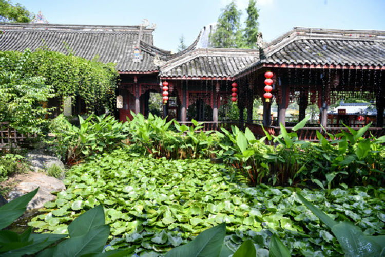 ↑這是7月10日拍攝的重慶璧山秀湖國家濕地公園仿古建筑群秀湖水街一家臨水而建的茶社。新華社記者 劉潺 攝