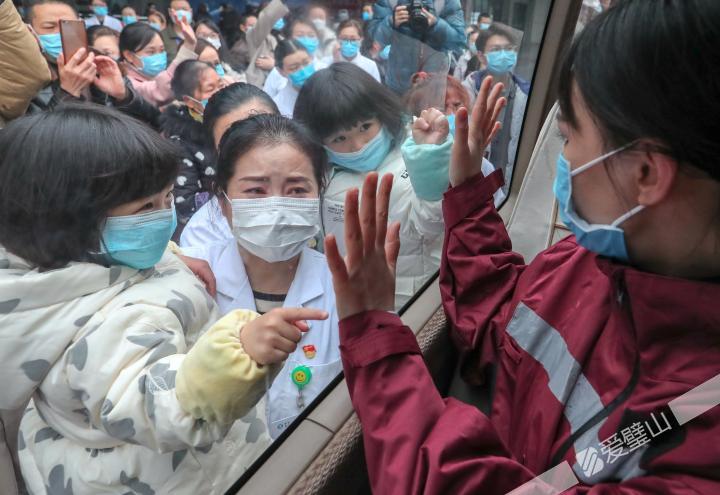 “媽媽加油,平安歸來!”11日,璧山區(qū)人民醫(yī)院援鄂出征時(shí),重癥醫(yī)學(xué)科護(hù)士王春蘭的5歲女兒和3歲女兒透過車窗為媽媽加油送行。(記者謝捷攝)