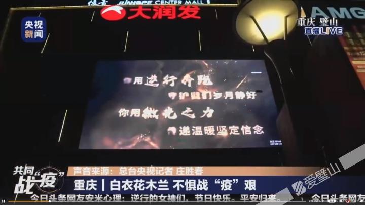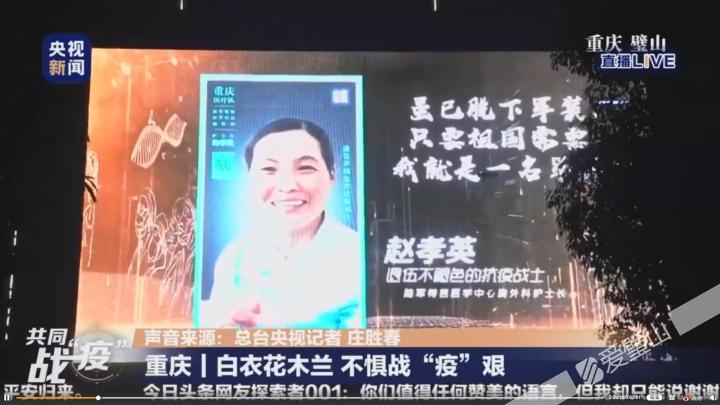 在“三.八”國際婦女節來臨之際,央視新聞“共同戰‘疫’我的同鄉英雄”與北京、上海、重慶等15座城市聯動,通過直播的形式,將鏡頭對準奮戰在抗疫前線的女性醫護人員,致敬逆行中最美的“她”。從3月8日晚上開始,包括璧山在內的重慶50余處地標建筑的3200余個戶外屏幕同時亮起,來自重慶赴湖北醫療隊的劉華、宋彩萍、趙孝英、黃霞、張晞5位女性醫護工作者的照片閃耀在山城之間,成為了夜空中最亮的“星”。
