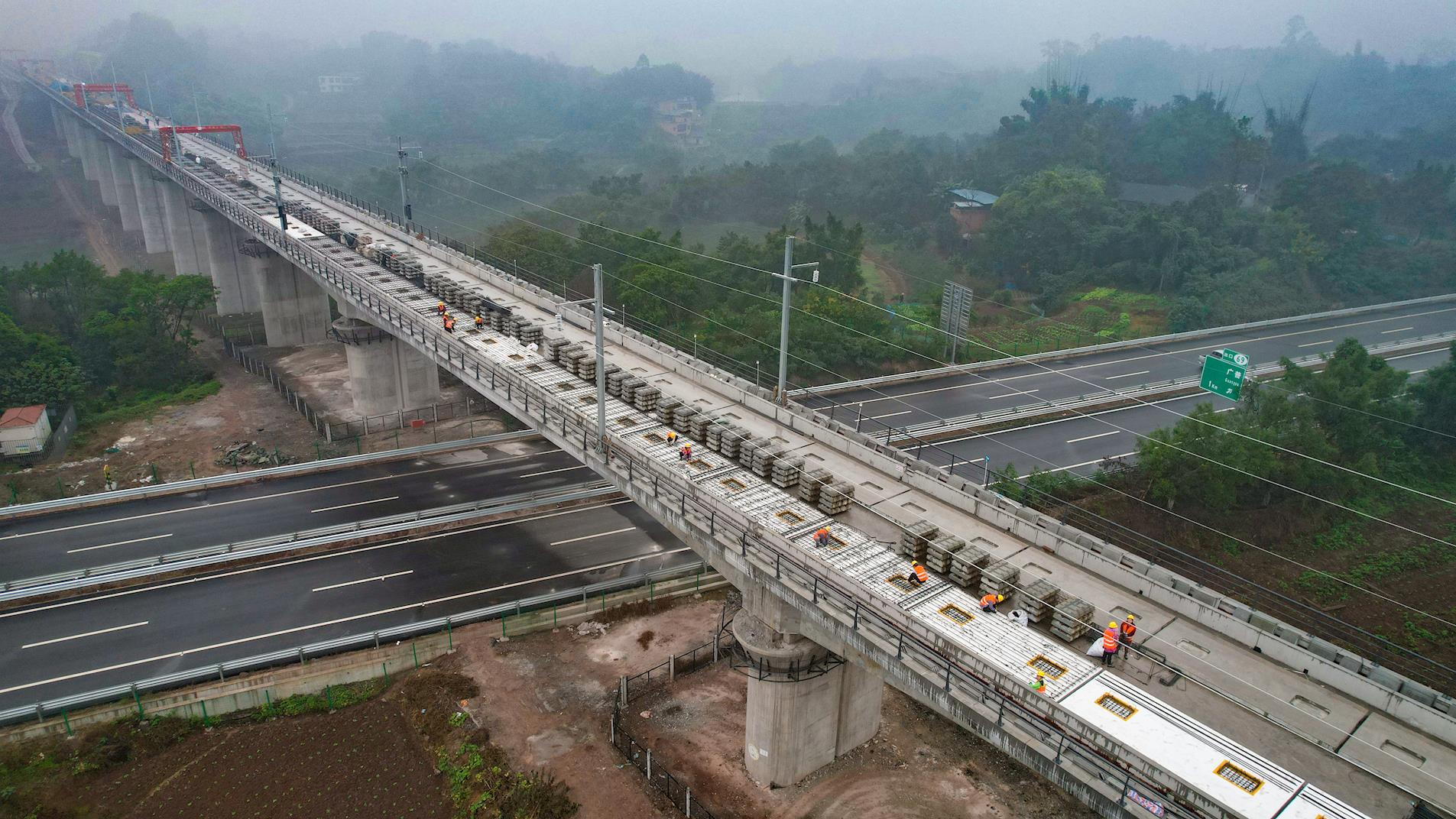 11月30日,位于廣普鎮(zhèn)的渝昆高鐵川渝段大石塔村特大橋施工現(xiàn)場,工人正在橋梁上進行無砟軌道施工。據(jù)悉,渝昆高鐵川渝段箱梁已于日前全部架設(shè)完成,為渝昆高鐵川渝段全線早日通車打下了堅實基礎(chǔ)。