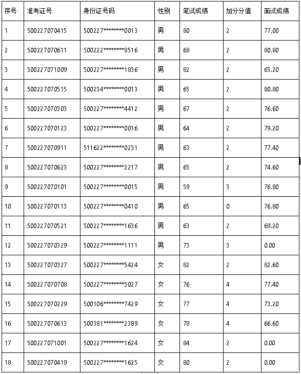 現將2024年3月公開在后備庫中選拔社區專職工作者成績(含筆試成績、加分、面試成績)予以公示。初步體檢時間定于2024年3月29日,體檢人員由重慶聚賢人力資源管理有限責任公司電話通知。