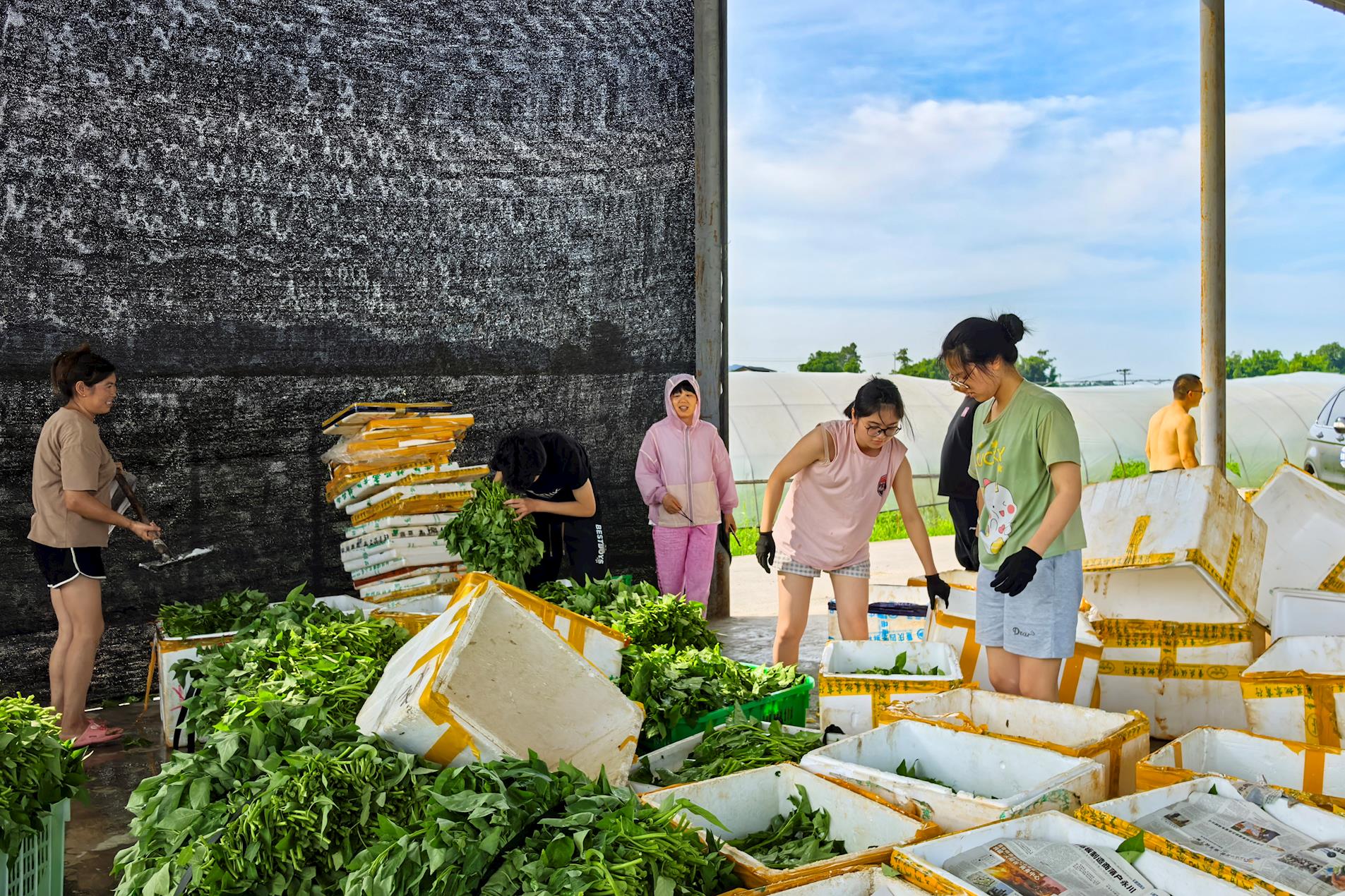 在八塘鎮智燈村5組的瀟瀟蔬菜種植園,一大早,工作人員便來到蔬菜大棚采收當天的青菜。“天氣炎熱,白天大棚內溫度太高,所以我們采取了錯峰作業的方式,采摘時間一般為清晨5點到8點,若是訂單較多,下午5點之后也會進行采收。”蔬菜種植園負責人肖萍表示,高溫季節,種植園不僅關注大棚的通風和人員的防暑降溫情況,還要在晚上完成排水、施肥等田間管理工作,從而確保蔬菜產量和品質不受影響。