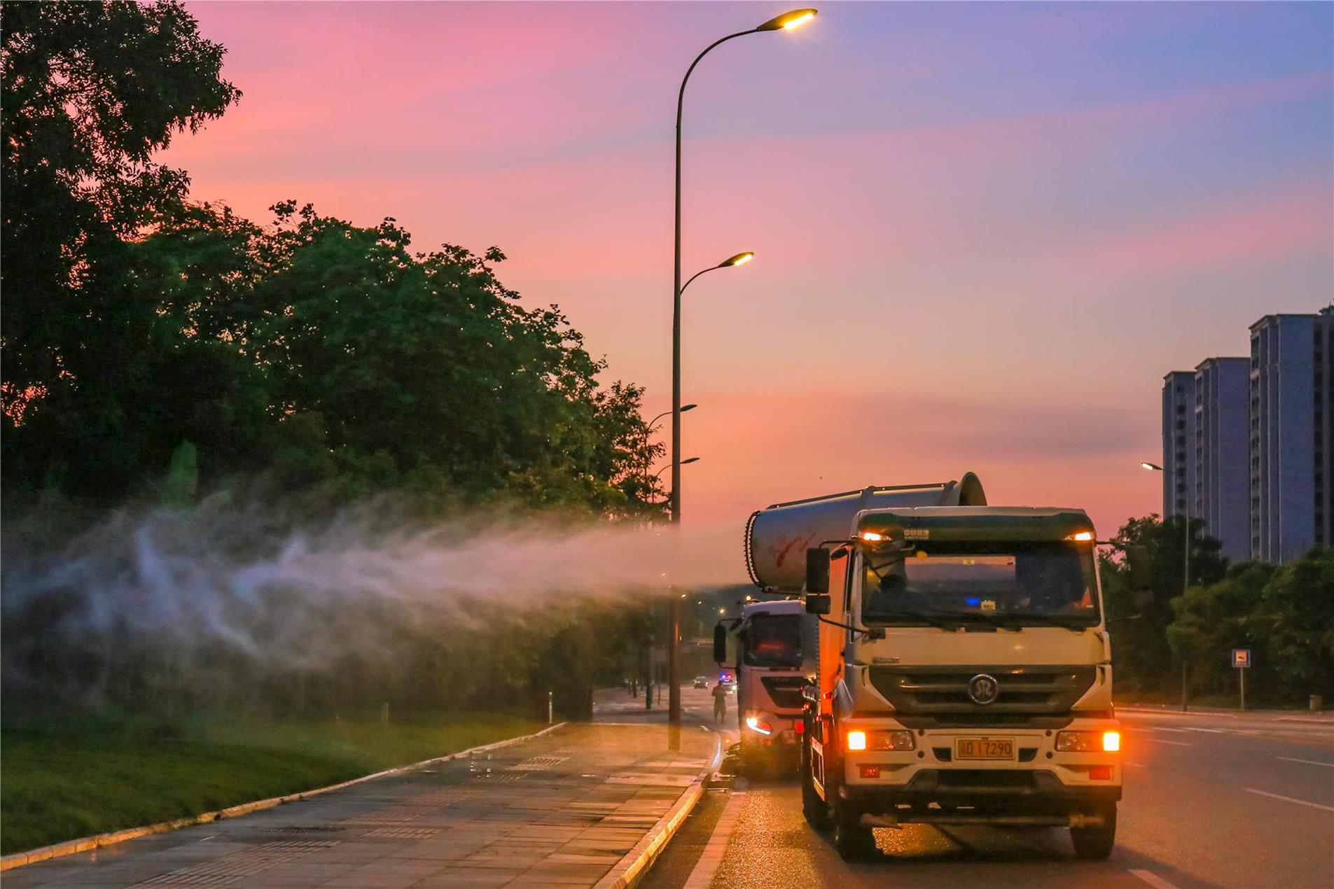 8月16日晚上11點,雙星大道,綠化工人們操控著水車,對行道樹、綠化帶進行澆灌。經過一天炙熱“烤”驗的苗木獲得充足的水分,恢復了往日的生機。