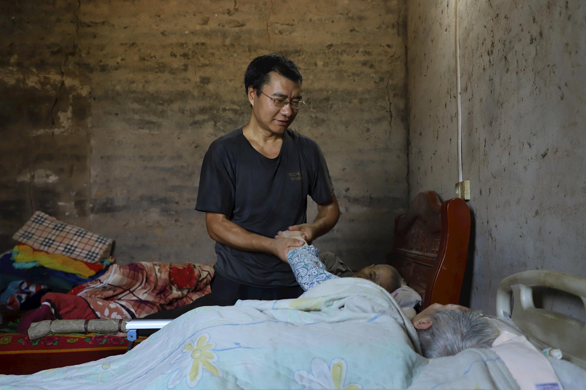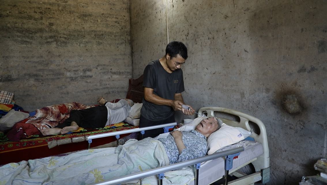 簡陋的房間里,燈光忽明忽暗,門口的老式電風扇正嘎吱嘎吱地轉著,兩張舊床上,各躺著一位癱瘓老人,床邊還擺著各種沒有吃完的藥盒子。一位中年男人正嫻熟地為一位老人按摩、翻身、擦拭身體......