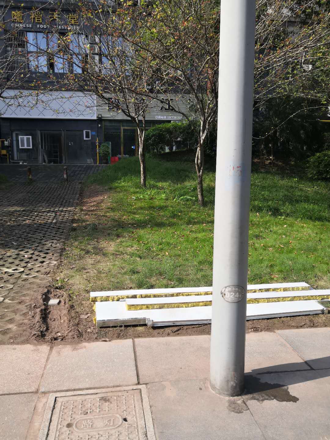 沿河西路南段024電桿旁市民把廢棄木板放綠化帶