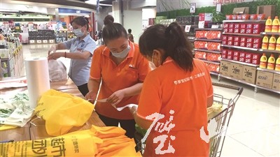 疫情防控期間,網(wǎng)上訂單大幅增長。據(jù)重百商場客戶經(jīng)理甘紅梅介紹,為減少居民外出聚集帶來的風(fēng)險(xiǎn),借助多點(diǎn)App、微信小程序等平臺(tái)提供線上點(diǎn)單服務(wù),用戶可在每天7:30—20:30期間點(diǎn)單,由第三方平臺(tái)配送到家。同時(shí),要求揀貨員、配送員佩戴口罩、手套進(jìn)行無接觸配送,確保市民買到放心菜、安全菜。