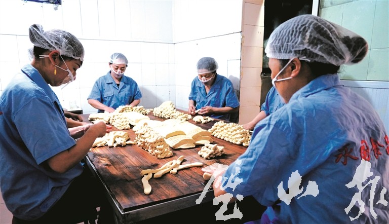 在制作室里,工人將搓揉勁道的面團切成一條一條的,再熟練地搓揉捻扯,瞬間就變成一個個大小均勻的麻花。