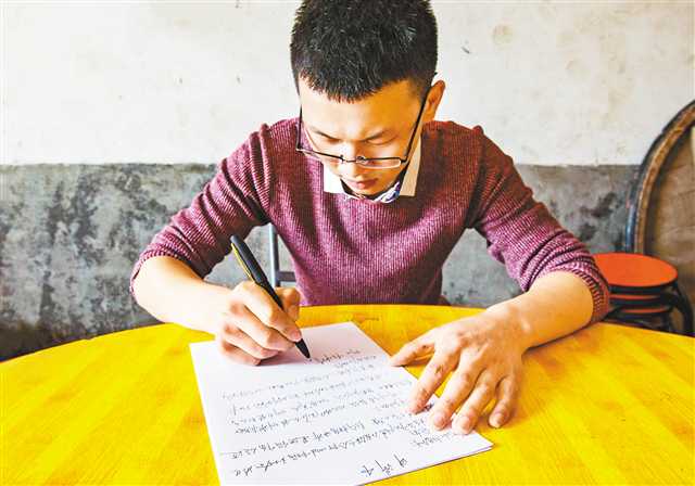 3月27日,王加春正在寫申請書,要求退出低保。記者 齊嵐森 攝
