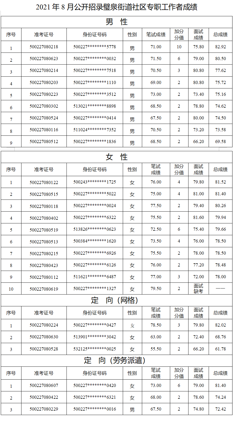 現將2021年8月公開招錄璧泉街道社區(qū)專職工作者成績(含筆試成績、加分、面試成績)予以公示。男、女前3名,定向(網格)第1名、定向(勞務派遣)第1名進入體檢。初步體檢時間定于2021年9月3日,體檢人員由重慶聚賢人力資源管理有限責任公司電話通知。