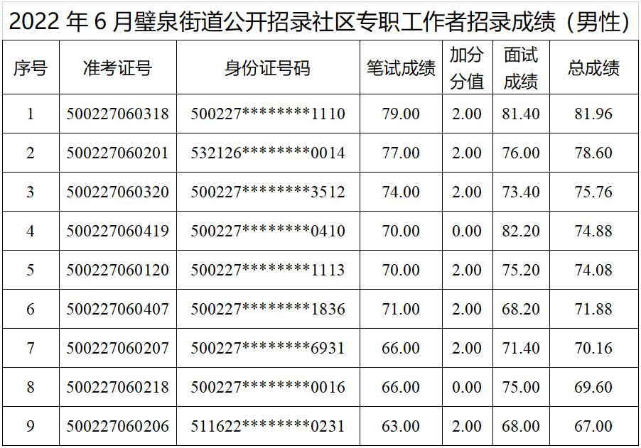 關于2022年6月公開招錄璧泉街道 社區專職工作者成績公示