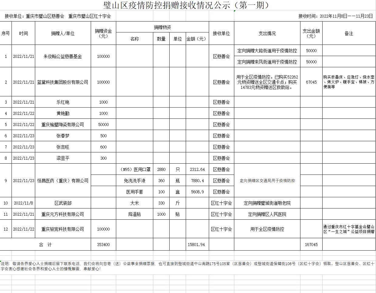 璧山區疫情防控捐贈接收情況公示(第一期)