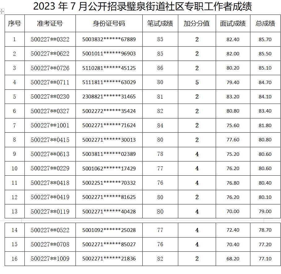 關于2023年7月公開招錄璧泉街道 社區專職工作者成績公示