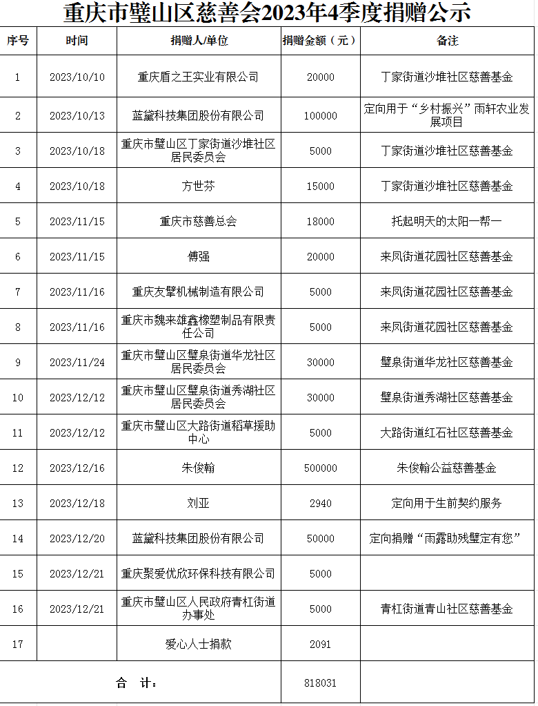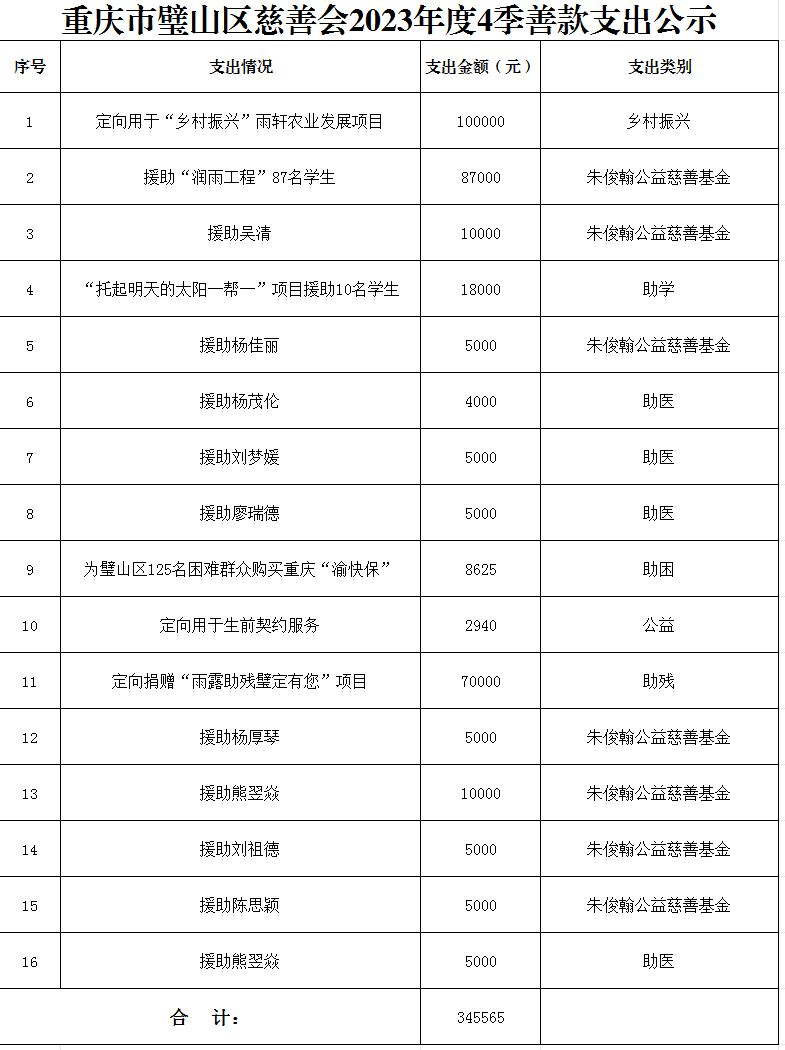 重慶市璧山區(qū)慈善會2023年度4季度善款捐贈和支出公示