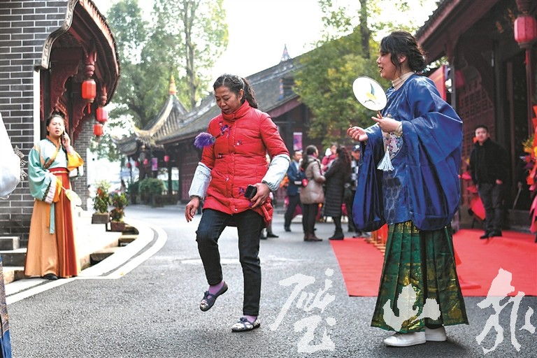 秀湖國(guó)際非遺小鎮(zhèn),游客踢毽子。