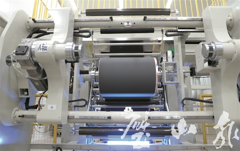 4月10日,在重慶弗迪生產基地,“刀片電池”負極生產線正在高速運轉,石墨和一些輔料先被混合攪拌成漿料,再涂布到銅箔上。銅箔以每分鐘70米的速度展開,經過涂布后送往烤箱烘干,再進行輥壓。雖然生產線正在高速運轉,但較遠處看上去又像是靜止的,除非將眼睛湊到設備前仔細觀看。