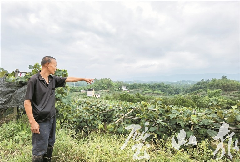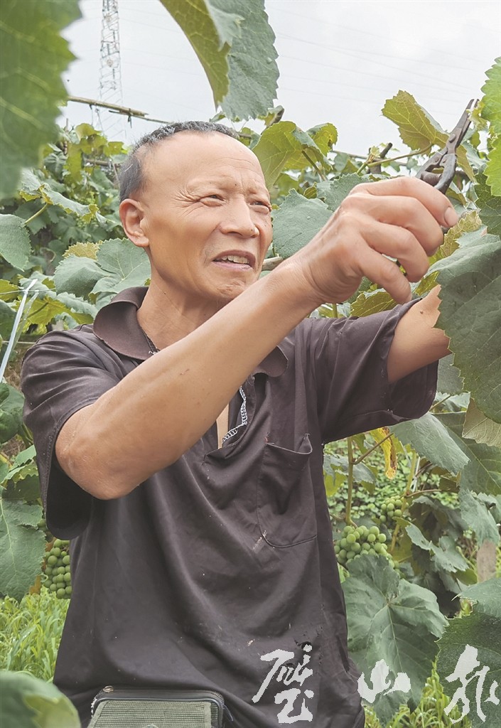 經過一場大雨的洗滌,5 月的鄉村空氣更加清新,在大興鎮蓮生村,遍野的葡萄長得更加蔥綠。57歲的張世前正在自家葡萄地里,修剪雨后猛長的葡萄枝。