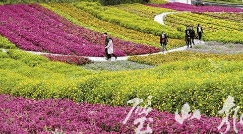 大路街道三擔湖公園“花海”綻放,市民在此暢游。