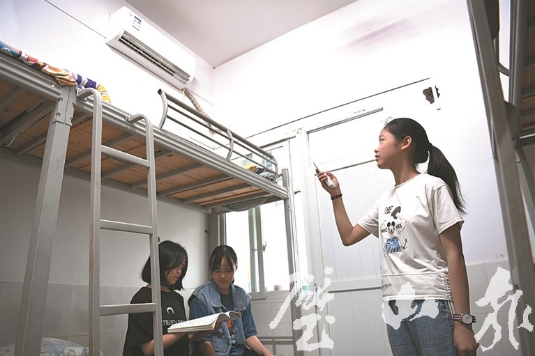 右圖:7月6日,大興中學(xué),學(xué)生在寢室內(nèi)打開(kāi)新安裝的空調(diào)。