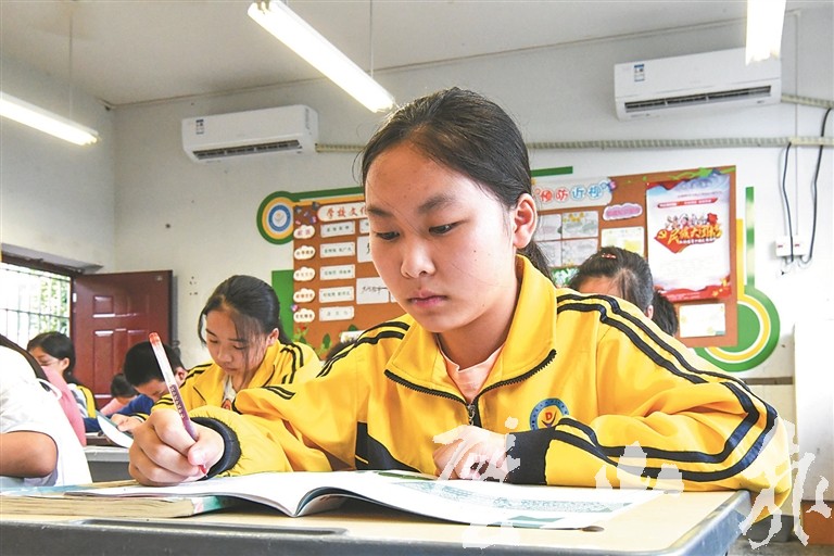 左圖:7月6日,大興中學(xué)教室內(nèi),學(xué)生吹著嶄新的空調(diào)學(xué)習(xí)。