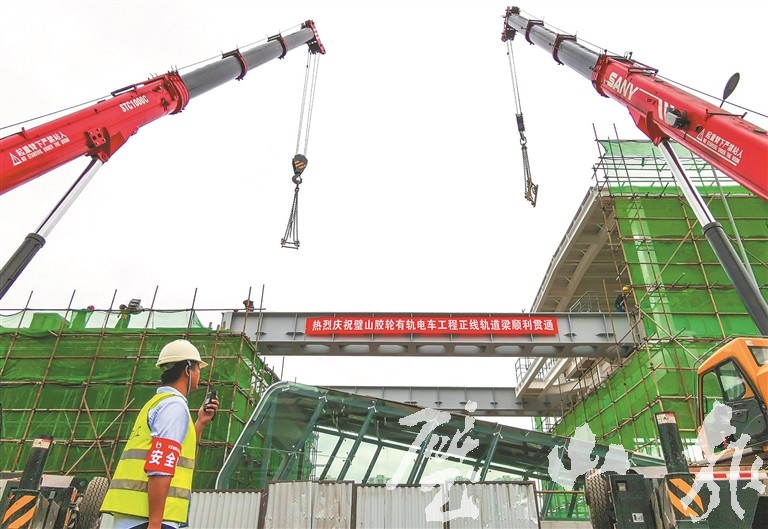 8月24日,隨著最后兩節鋼軌緊緊地連接在一起,璧山“云巴”示范線正式完成軌道鋪設工作,實現全線“軌通”。目前,“云巴”項目樁基、承臺、墩柱、蓋梁、軌道梁架設已全部完成,疏散平臺建設完成90.9%;車站主體鋼結構施工已全部完成,正在車站砌筑及裝飾裝修施工,該示范線預計將于9月進行通車試運行。