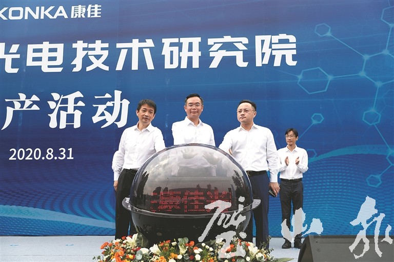 活動(dòng)上,藍(lán)慶華、周彬、李宏韜共同觸摸“康佳光電科技球”,宣告重慶康佳光電技術(shù)研究院投產(chǎn)。