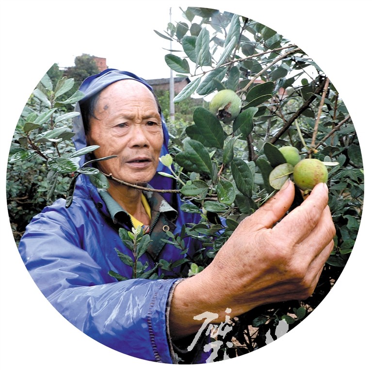 近日,細雨霏霏,走進大興鎮高橋村菲油果種植基地,放眼望去,成片的菲油果樹上,一顆顆翠綠的菲油果在微風中輕輕擺動,不時散發著濃郁的果香?;乩?,年近70歲的黎永全身著雨衣,背著背簍,正麻利地采摘著成熟的菲油果。