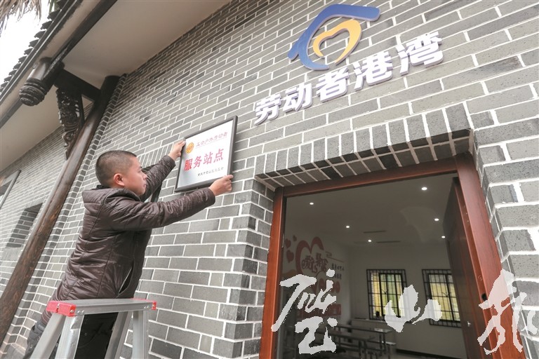 工作人員為“勞動者港灣”掛牌
