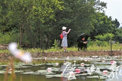 紅粉伊人枕波眠,風(fēng)掀碧裙任纏綿。5月10日,三合鎮(zhèn)沙坤井生態(tài)濕地公園睡蓮盛開,粉綠相間,吸引不少居民前來打卡拍照。據(jù)了解,該公園占地面積15畝,其中水生植物栽種面積11畝,內(nèi)有觀景亭一座,觀景步道長900米,公園內(nèi)種有廣玉蘭、佛頂桂、再力花、睡蓮等27種植物,為附近村民休閑散步提供了一片生態(tài)綠地。