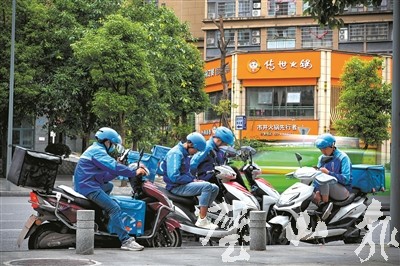 ④6月18日,攝影愛好者奔走于璧山城區,記錄下騎手們等待接單的工作場景。(楊文廣 攝)