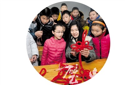 大學(xué)生志愿者教留守兒童做中國結(jié)。