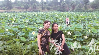 7月6日,驕陽下,青杠街道中興村的荷塘內,朵朵荷花競相開放,映襯著綠葉,倒映于水面,特別養眼,吸引了不少市民前去拍照打卡。