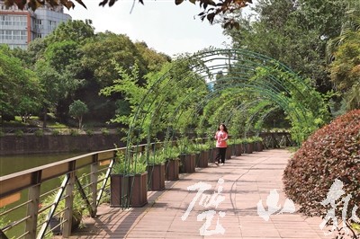 7月13日早上,璧南河沿河東路南段,市民在新建的休閑區域內散步,十分愜意舒適。為提升城市品質,增添城市風韻與活力,我區將在璧南河沿線人流量較大的濱水步道區域,打造包括水景觀、花廊、運動區、棋牌“微客廳”等在內的20處景觀節點。目前,已有19處景觀節點完成打造。(記者 朱大亮 通訊員 郭娟 實習生 黃麟稀 攝)