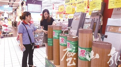 7月19日,市民正在中央大街超市內選購夏季用品。夏日來臨,市民紛紛開始準備涼席、蚊香、花露水等夏季日用品,商場迎來夏季用品銷售高峰,銷售量也節節攀升。目前,我區各大商家準備了豐富的防暑用品,供消費者選購。(記者 楊文廣 實習生 譚靖怡 攝)