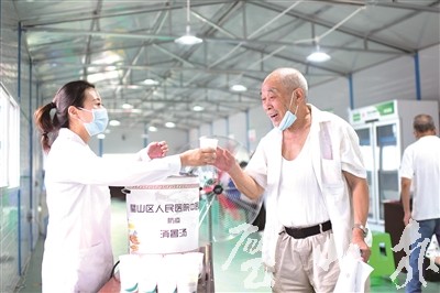 7月29日,在大成廣場接種后的市民正飲用解暑茶湯。據(jù)悉,大暑時節(jié),璧山進入高溫酷暑天氣,區(qū)人民醫(yī)院將73份主要功效為消暑、清熱、解毒、祛濕的中藥解暑茶湯和兒童飲品冰鎮(zhèn)酸梅湯,送到區(qū)內(nèi)新冠疫苗接種方艙等防疫一線,助力璧山疫情防控工作。